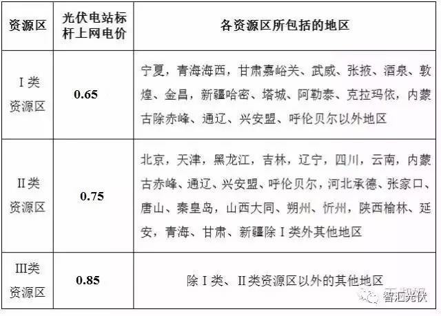 全國(guó)分為三類電價(jià)區(qū),光伏標(biāo)桿電價(jià)分別為0.65元/kWh、0.75元/kWh、0.85元/kWh。