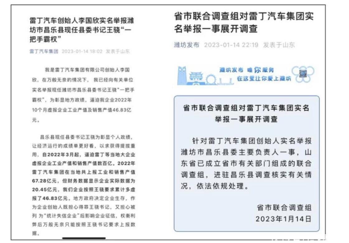 1月14日小年夜,一篇題為《雷丁汽車創(chuàng)始人李國欣實(shí)名舉報(bào)濰坊市昌樂縣現(xiàn)任縣委書記王驍“一把手霸權(quán)”》的文章在各大社交平臺“刷屏”,該篇文章由“雷丁汽車集團(tuán)”微信公眾號發(fā)布。同時(shí),雷丁汽車創(chuàng)始人李國欣在雷丁汽車視頻號發(fā)布了一則時(shí)長約一分鐘的視頻,稱“昌樂縣現(xiàn)任縣委書記王驍逼迫公司提報(bào)虛假統(tǒng)計(jì)數(shù)據(jù)近50億元”。