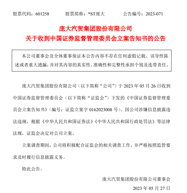 5月26日,*ST龐大再發(fā)公告稱,公司于5月26日收到中國證券監(jiān)督管理委員會(以下簡稱證監(jiān)會)下發(fā)的《中國證券監(jiān)督管理委員會立案告知書》。因公司涉嫌信息披露違法違規(guī),根據(jù)相關(guān)法律法規(guī),證監(jiān)會決定對公司立案。立案調(diào)查期間,公司將積極配合證監(jiān)會的相關(guān)調(diào)查工作,并嚴(yán)格按照監(jiān)管要求及時履行信息披露義務(wù)。
