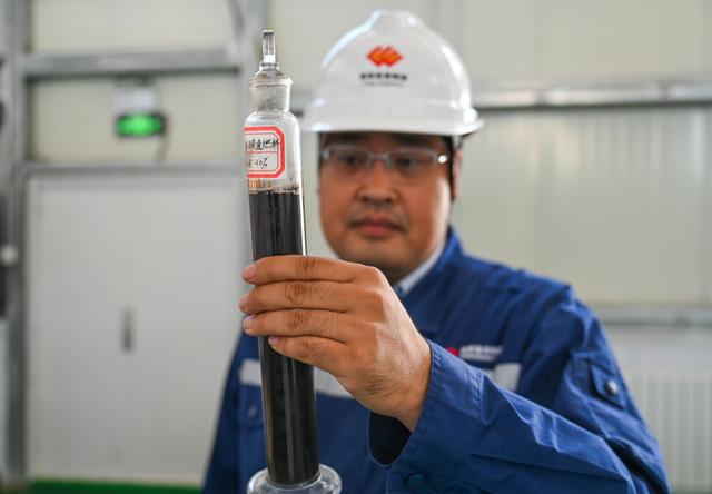 7月7日,國能準(zhǔn)能集團(tuán)煤基納米碳?xì)淙剂宪囬g主任甄鵬在展示該燃料的樣品。