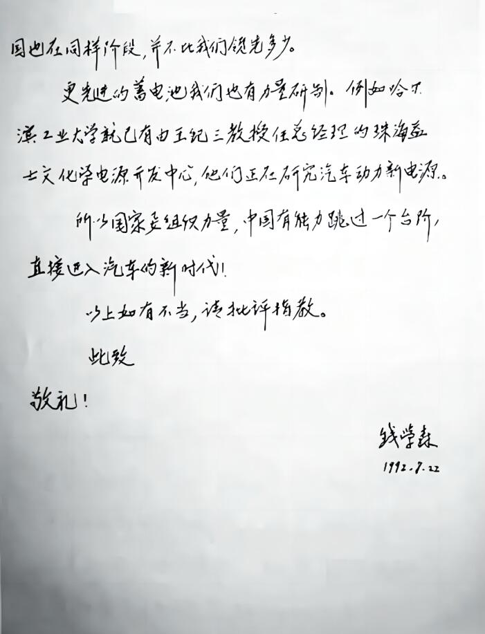 1992年,當(dāng)時(shí)已81歲高齡的錢(qián)學(xué)森寫(xiě)信給時(shí)任副總理鄒家華,提出了一個(gè)高瞻遠(yuǎn)矚的建議:“我國(guó)汽車(chē)工業(yè)應(yīng)跳過(guò)用汽油柴油階段,直接進(jìn)入減少環(huán)境污染的新能源階段……到下個(gè)世紀(jì)20年代保護(hù)環(huán)境將是十分重要問(wèn)題?,F(xiàn)在美國(guó)、日本、西歐都在組織各自技術(shù)力量攻高效蓄電池,計(jì)劃開(kāi)發(fā)出蓄電池汽車(chē)。”
