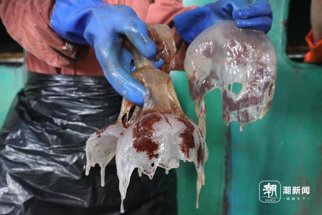 “抓海蜇的第一個小時還有點新鮮感,第二小時就不行了,腿酸。濾網時不時會有海水濺出來,整個人全部濕掉,又腥又臭。等到最后值班時間結束,雙腿沉得不像自己的。”有過來人這么形容和海蜇“戰(zhàn)斗”的感受。