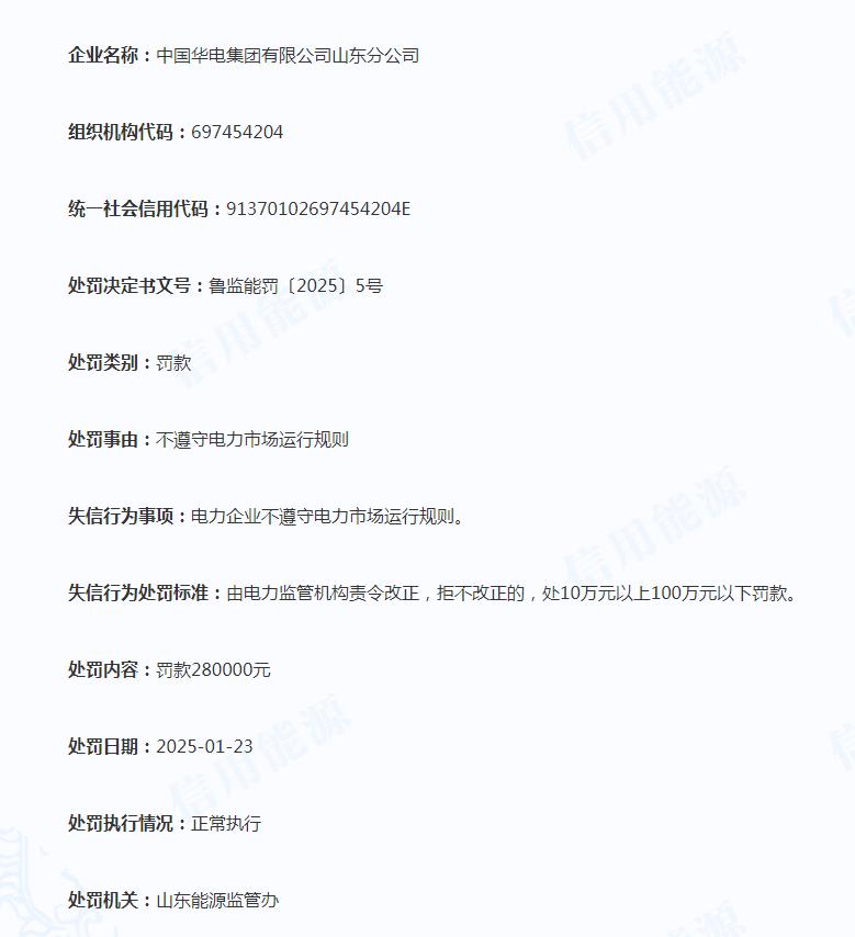 日前,信用能源公布了對(duì)中國(guó)華電集團(tuán)有限公司山東分公司的行政處罰決定,魯監(jiān)能罰〔2025〕5號(hào)處罰決定書(shū)文號(hào)顯示,中國(guó)華電集團(tuán)有限公司山東分公司不遵守電力市場(chǎng)運(yùn)行規(guī)則,山東能源監(jiān)管辦對(duì)其作出罰款280000元處罰。