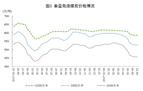 煤炭?jī)r(jià)格有所下跌。截至4月底,秦皇島5500大卡煤炭平倉(cāng)價(jià)為每噸587元,比3月底下降20元;5000大卡每噸529元,下降35元;4500大卡每噸457元,下降34元。