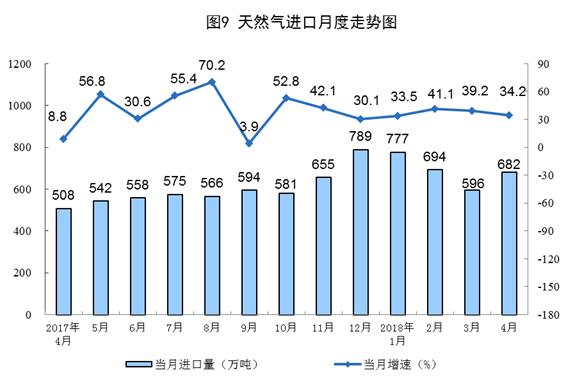 天然氣進(jìn)口連續(xù)7個(gè)月保持30%以上的高速增長(zhǎng)。4月份,天然氣進(jìn)口682萬(wàn)噸,同比增長(zhǎng)34.2%,增速比上月回落5個(gè)百分點(diǎn)。1-4月份,進(jìn)口天然氣2742萬(wàn)噸,同比增長(zhǎng)36.4%。
