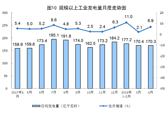 4月份,受用電需求增加影響,電力生產(chǎn)明顯加快,發(fā)電量5107.8億千瓦時(shí),同比增長(zhǎng)6.9%,增速比上月加快4.8個(gè)百分點(diǎn)。1-4月份,發(fā)電量同比增長(zhǎng)7.7%,增速較1-3月份回落0.3個(gè)百分點(diǎn)。