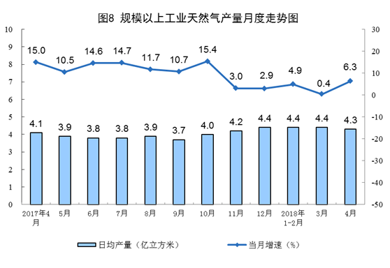 4月份,天然氣生產(chǎn)保持高位,產(chǎn)量128.9億立方米,同比增長(zhǎng)6.3%,增速比上月加快5.9個(gè)百分點(diǎn);日均生產(chǎn)4.3億立方米,比上月減少0.1億立方米。