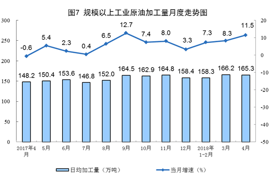 受去年同期大型石化企業(yè)停產(chǎn)檢修較多,以及今年原油進(jìn)口配額和成品油出口配額均大幅增加等多重因素影響,原油加工量增長(zhǎng)較快。4月份,原油加工量4958萬(wàn)噸,同比增長(zhǎng)11.5%,比上月加快3.2個(gè)百分點(diǎn);日均加工165.3萬(wàn)噸,比上月減少0.9萬(wàn)噸。