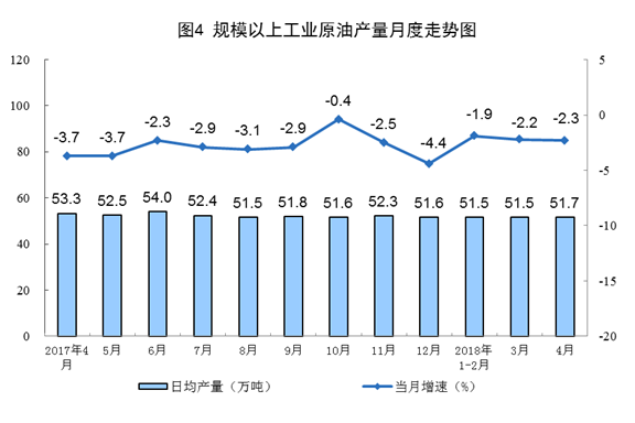 4月份,原油生產(chǎn)1551萬(wàn)噸,同比下降2.3%,降幅比上月擴(kuò)大0.1個(gè)百分點(diǎn);日均產(chǎn)量51.7萬(wàn)噸,比上月增加0.2萬(wàn)噸。