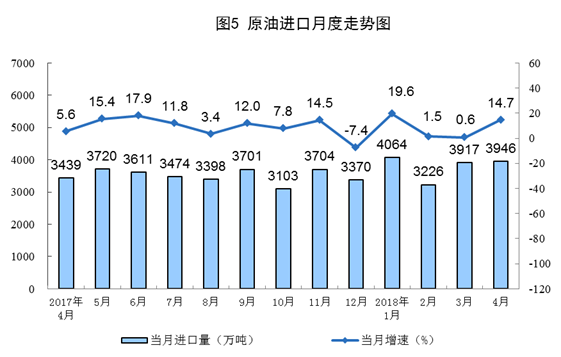 4月份,原油進(jìn)口大幅增長(zhǎng),進(jìn)口3946萬(wàn)噸,同比增長(zhǎng)14.7%,增速比上月加快14.1個(gè)百分點(diǎn);日均進(jìn)口131.5萬(wàn)噸,再創(chuàng)歷史新高。1-4月份,進(jìn)口原油1.5億噸,同比增長(zhǎng)8.9%。