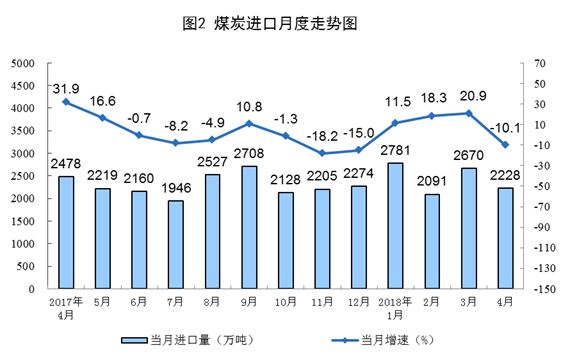 煤炭進(jìn)口大幅下降。4月份,進(jìn)口煤炭2228萬(wàn)噸,同比下降10.1%。1-4月份,進(jìn)口煤炭9768萬(wàn)噸,同比增長(zhǎng)9.3%。