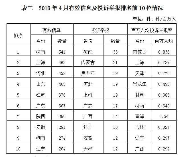 2018年4月,各?。ㄗ灾螀^(qū)、直轄市)按照有效信息數(shù)量排序,河南、上海、河北等省(市)列全國前10位;按照投訴舉報(bào)數(shù)量排序,河南、內(nèi)蒙古、黑龍江等省(自治區(qū))排在全國前10位;按照百萬人均投訴舉報(bào)率排序,內(nèi)蒙古、上海、天津等?。ㄊ?、自治區(qū))位于全國前10位。(2018年4月有效信息及投訴舉報(bào)排名前10位情況見表三)