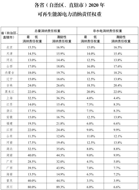 根據(jù)《國家發(fā)展改革委 國家能源局關(guān)于建立健全可再生能源電力消納保障機(jī)制的通知》(發(fā)改能源〔2019〕807號),在各地測算的基礎(chǔ)上,我們統(tǒng)籌提出了各省級行政區(qū)域2020年可再生能源電力消納責(zé)任權(quán)重,現(xiàn)印發(fā)你們,請認(rèn)真組織落實。
