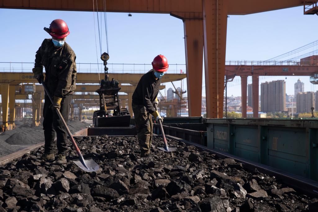 10月12日,在綏芬河鐵路口岸換裝現(xiàn)場(chǎng),工人進(jìn)行煤炭平整作業(yè)。新華社記者 張濤 攝