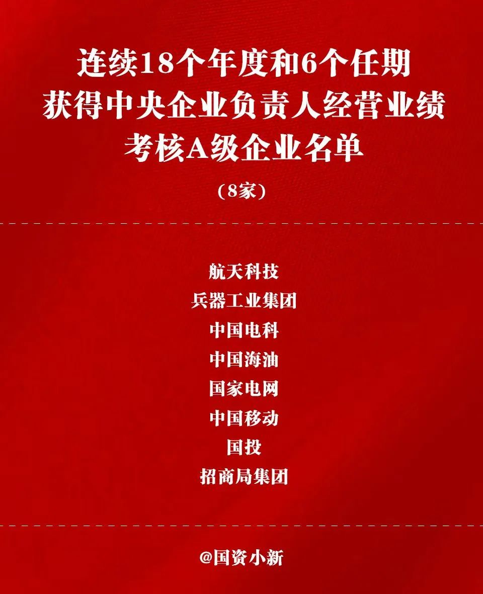 國資委對中央企業(yè)實施經(jīng)營業(yè)績考核以來,有8家企業(yè)連續(xù)18個年度和6個任期均獲得A級,分別是航天科技、兵器工業(yè)集團、中國電科、中國海油、國家電網(wǎng)、中國移動、國投、招商局集團。