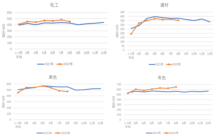 8月份,化工行業(yè)用電量452億千瓦時(shí),同比增長(zhǎng)2.7%;建材行業(yè)用電量354億千瓦時(shí),同比下降6.7%;黑色金屬冶煉行業(yè)用電量474億千瓦時(shí),同比下降15.0%;有色金屬冶煉行業(yè)用電量652億千瓦時(shí),同比增長(zhǎng)7.1%。