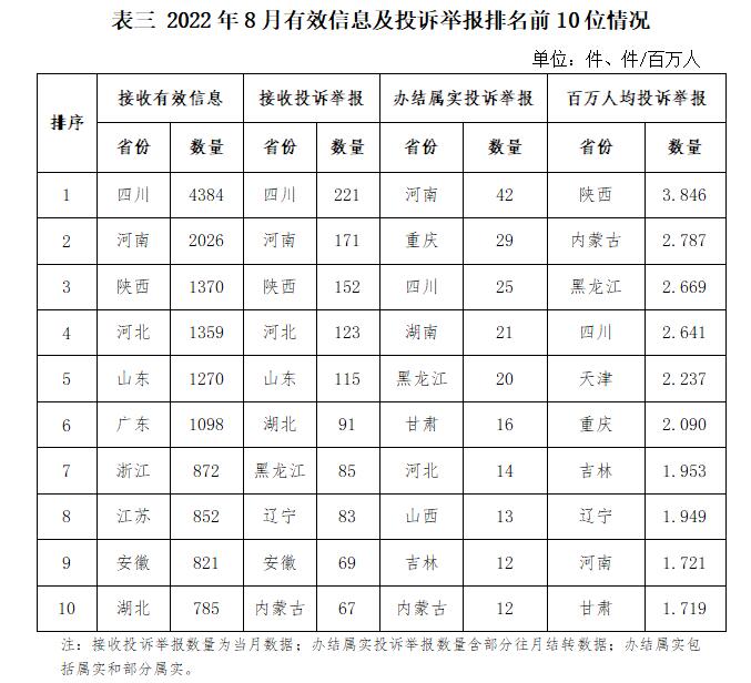 各省(自治區(qū)、直轄市)按照接收的有效信息數(shù)量排序,四川、河南、陜西、河北、山東、廣東、浙江、江蘇、安徽、湖北排在全國前10位;按照接收的投訴舉報數(shù)量排序,四川、河南、陜西、河北、山東、湖北、黑龍江、遼寧、安徽、內(nèi)蒙古排在全國前10位;按照辦結(jié)屬實的投訴舉報數(shù)量排序,河南、重慶、四川、湖南、黑龍江、甘肅、河北、山西、吉林、內(nèi)蒙古排在全國前10位;按照百萬人均投訴舉報數(shù)量排序,陜西、內(nèi)蒙古、黑龍江、四川、天津、重慶、吉林、遼寧、河南、甘肅排在全國前10位。(2022年8月有效信息及投訴舉報排名前10位情況見表三)