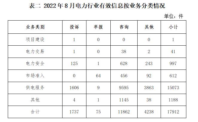 電力行業(yè)排在首位,有效信息數(shù)量為17912件,占全部有效信息的80.75%。群眾關注的內(nèi)容主要集中在供電服務、電力安全、市場準入等方面。(2022年8月電力行業(yè)有效信息按業(yè)務分類情況見表二)