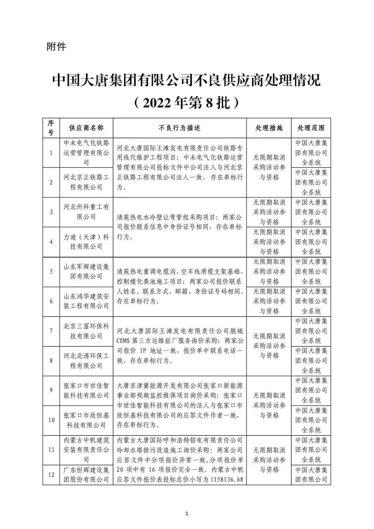 附件: 中國大唐集團有限有限公司供應商不良行為處理情況(2022年第8批)