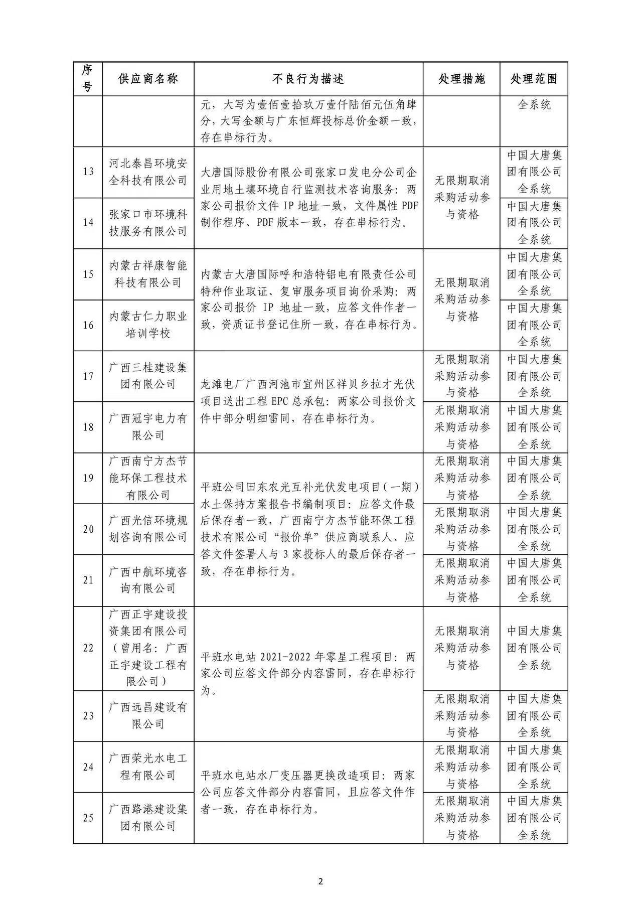 中國大唐集團有限公司關(guān)于供應商不良行為處理情況的公告 (2022年第8批)