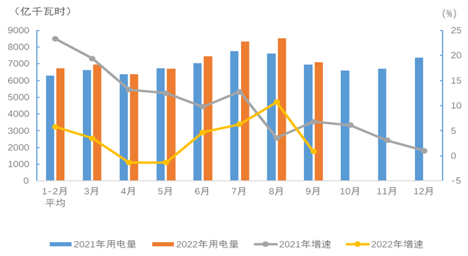 圖1 2021、2022年分月全社會(huì)用電量及其增速