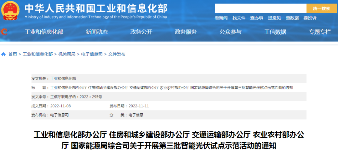 為進(jìn)一步促進(jìn)光伏產(chǎn)業(yè)與新一代信息技術(shù)深度融合,推動(dòng)智能光伏技術(shù)進(jìn)步和行業(yè)應(yīng)用,根據(jù)《智能光伏產(chǎn)業(yè)創(chuàng)新發(fā)展行動(dòng)計(jì)劃(2021—2025年)》(工信部聯(lián)電子〔2021〕226號(hào))工作部署,工業(yè)和信息化部、住房和城鄉(xiāng)建設(shè)部、交通運(yùn)輸部、農(nóng)業(yè)農(nóng)村部、國(guó)家能源局決定組織開展第三批智能光伏試點(diǎn)示范活動(dòng)。有關(guān)事項(xiàng)通知如下: