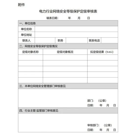 第九條 電力企業(yè)辦理網(wǎng)絡(luò)安全等級保護(hù)定級審核手續(xù)時(shí),應(yīng)當(dāng)提交《電力行業(yè)網(wǎng)絡(luò)安全等級保護(hù)定級審核表》(詳見附件),含各定級對象的定級報(bào)告及專家評審意見。