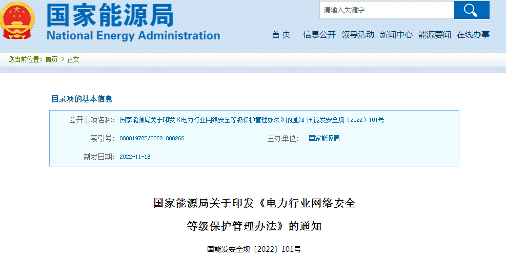 國家能源局關(guān)于印發(fā)《電力行業(yè)網(wǎng)絡(luò)安全等級保護(hù)管理辦法》的通知