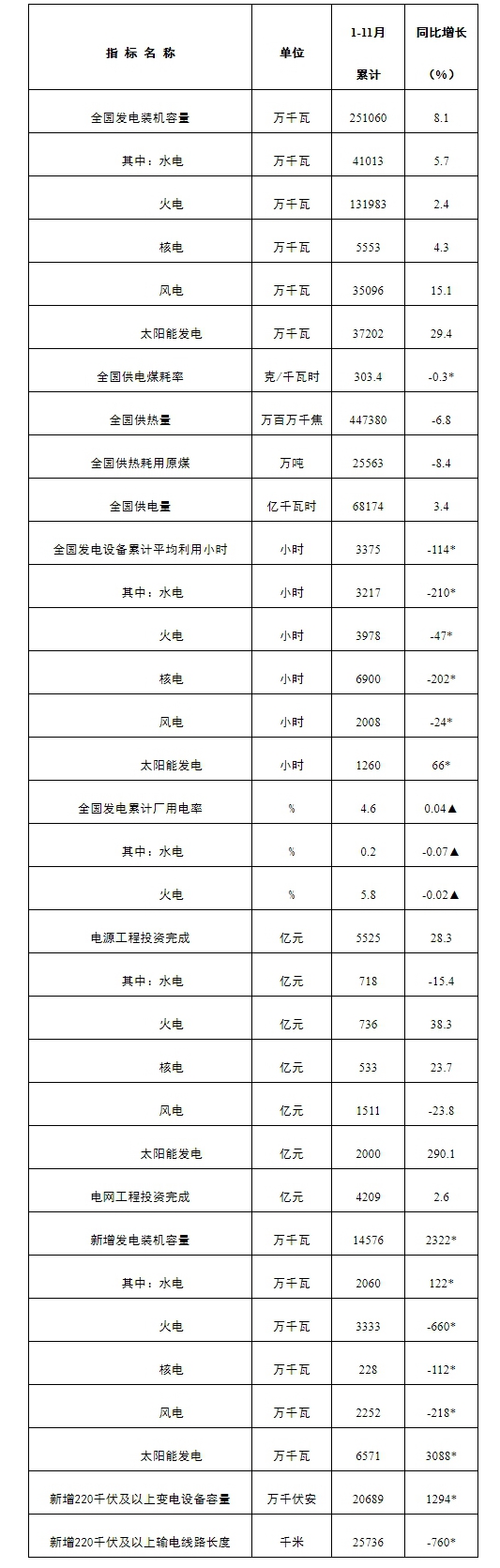 12月16日,國(guó)家能源局發(fā)布1-11月份全國(guó)電力工業(yè)統(tǒng)計(jì)數(shù)據(jù)。