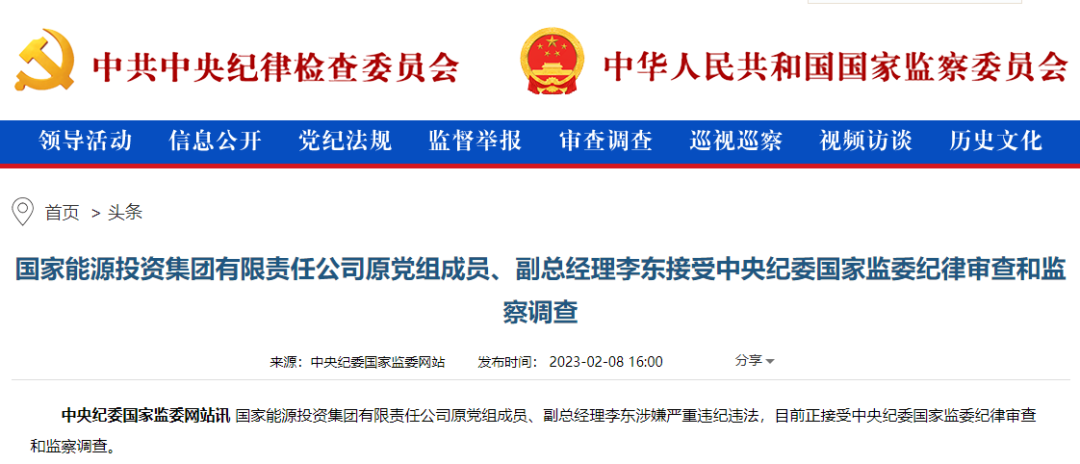 2月8日,據(jù)中央紀(jì)委國家監(jiān)委網(wǎng)站消息,國家能源投資集團(tuán)有限責(zé)任公司原黨組成員、副總經(jīng)理李東涉嫌嚴(yán)重違紀(jì)違法,目前正接受中央紀(jì)委國家監(jiān)委紀(jì)律審查和監(jiān)察調(diào)查。