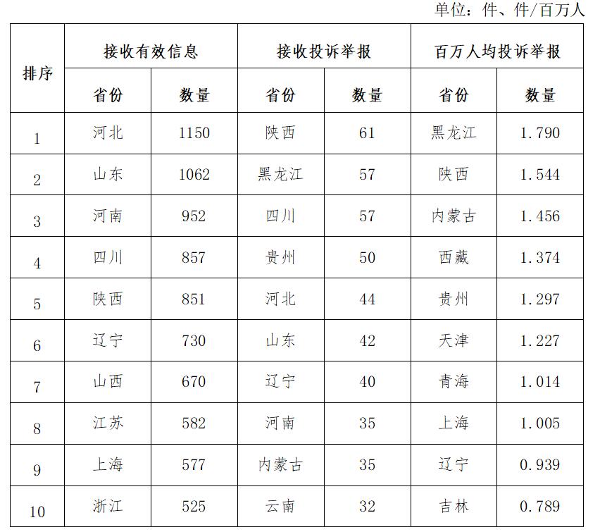 各省(自治區(qū)、直轄市)按照接收的有效信息數(shù)量排序,河北、山東、河南、四川、陜西、遼寧、山西、江蘇、上海、浙江排在全國前10位;按照接收的投訴舉報數(shù)量排序,陜西、黑龍江、四川、貴州、河北、山東、遼寧、河南、內(nèi)蒙古、云南排在全國前10位;按照百萬人均投訴舉報數(shù)量排序,黑龍江、陜西、內(nèi)蒙古、西藏、貴州、天津、青海、上海、遼寧、吉林排在全國前10位。(2023年1月有效信息及投訴舉報排名前10位情況見表三)