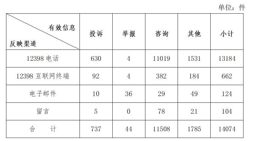 按反映渠道分類,12398電話13184件,12398互聯(lián)網(wǎng)終端662件,電子郵件124件,留言104件。