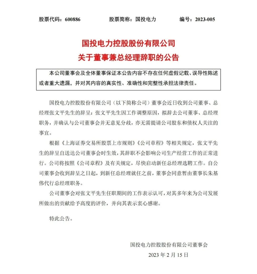 2月15日,國投電力發(fā)布關(guān)于董事兼總經(jīng)理辭職的公告。公告顯示,董事會近日收到公司董事、總經(jīng)理張文平先生的辭呈,張文平因工作調(diào)整原因,擬辭去公司董事、總經(jīng)理職務(wù),并確認(rèn)與公司董事會并無意見分歧,亦無需提請公司股東和債權(quán)人關(guān)注的事宜。