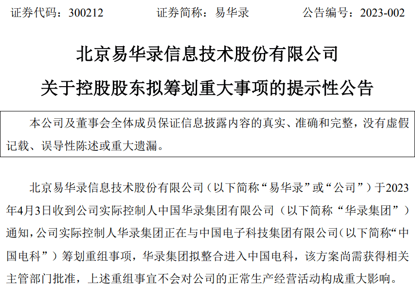 4月3日,北京易華錄信息技術(shù)股份有限公司發(fā)布公告稱,收到公司實(shí)際控制人中國華錄集團(tuán)有限公司(以下簡稱“華錄集團(tuán)”)通知,華錄集團(tuán)正在與中國電子科技集團(tuán)有限公司(以下簡稱“中國電科”)籌劃重組事項(xiàng),華錄集團(tuán)擬整合進(jìn)入中國電科。易華錄表示,該方案尚需獲得相關(guān)主管部門批準(zhǔn),上述重組事宜不會對公司的正常生產(chǎn)經(jīng)營活動構(gòu)成重大影響。公司將按照法律法規(guī)的要求及時披露進(jìn)展情況。