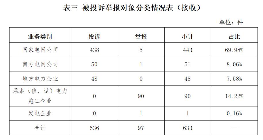 針對(duì)供電企業(yè)的投訴舉報(bào)542件、占比85.62%,其中國(guó)家電網(wǎng)公司443件、占比69.98%,南方電網(wǎng)公司51件、占比8.06%,地方電力企業(yè)48件、占比7.58%;針對(duì)承裝(修、試)電力施工企業(yè)的投訴舉報(bào)90件、占比14.22%;針對(duì)發(fā)電企業(yè)的投訴舉報(bào)1件、占比0.16%。(詳見(jiàn)表三)