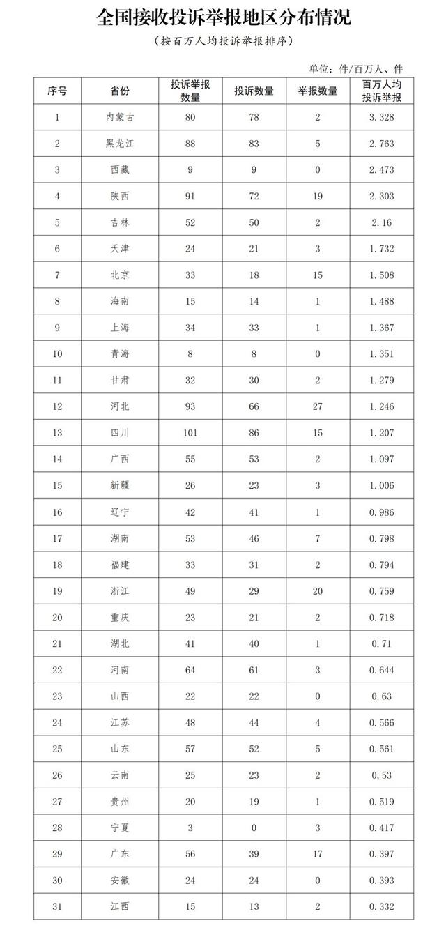 各省(自治區(qū)、直轄市)按照接收投訴舉報數(shù)量排序,四川、河北、陜西、黑龍江、內蒙古排在全國前5位。其中:按投訴數(shù)量排序,四川、黑龍江、內蒙古、陜西、河北排在全國前5位;按舉報數(shù)量排序,河北、浙江、陜西、廣東、北京(四川并列)排在全國前5位;按百萬人均投訴舉報數(shù)量排序,內蒙古、黑龍江、西藏、陜西、吉林排在全國前5位。(全國接收投訴舉報地區(qū)分布情況詳見附件1)