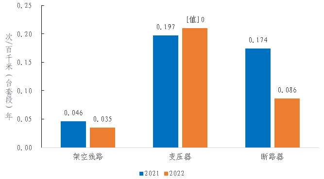 2022年,架空線路的強(qiáng)迫停運(yùn)率為0.035次/百千米年,同比減少0.011次/百千米年。變壓器的強(qiáng)迫停運(yùn)率為0.210次/百臺(tái)年,同比增加0.013次/百臺(tái)年。斷路器的強(qiáng)迫停運(yùn)率為0.086次/百臺(tái)年,同比減少0.088次/百臺(tái)年。