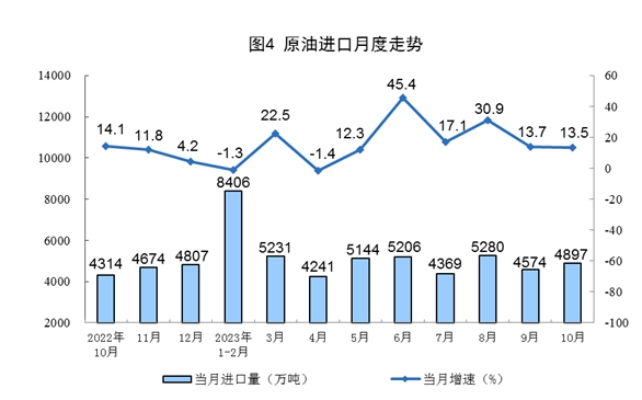 原油生產(chǎn)增速略有加快,進(jìn)口保持較快增長。10月份,生產(chǎn)原油1733萬噸,同比增長0.5%,增速比9月份加快0.2個(gè)百分點(diǎn),日均產(chǎn)量55.9萬噸。進(jìn)口原油4897萬噸,同比增長13.5%,增速比9月份放緩0.2個(gè)百分點(diǎn)。