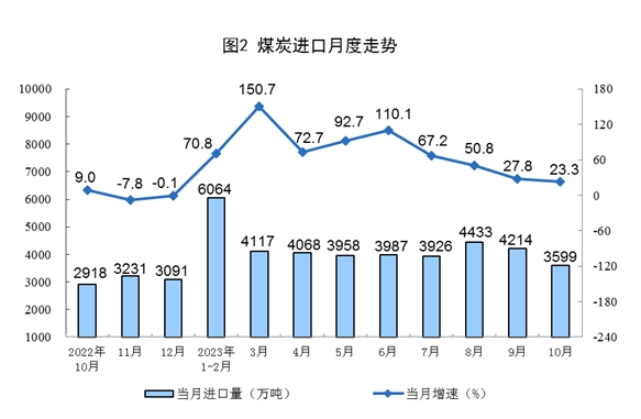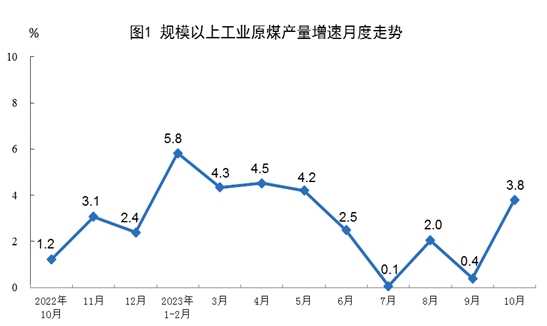 原煤生產(chǎn)增速加快,進(jìn)口較快增長。10月份,生產(chǎn)原煤3.9億噸,同比增長3.8%,增速比9月份加快3.4個(gè)百分點(diǎn),日均產(chǎn)量1254.0萬噸。進(jìn)口煤炭3599萬噸,同比增長23.3%,增速比9月份回落4.5個(gè)百分點(diǎn)。
