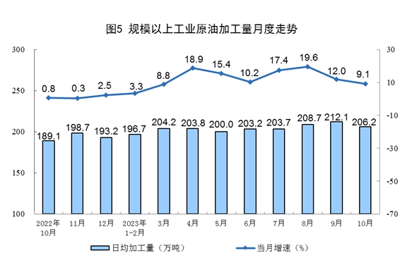 原油加工保持穩(wěn)定增長。10月份,加工原油6393萬噸,同比增長9.1%,增速比9月份放緩2.9個(gè)百分點(diǎn),日均加工原油206.2萬噸。1—10月份,加工原油61876萬噸,同比增長11.2%。