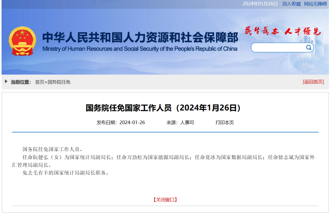 任命阮健弘(女)為國家統(tǒng)計局副局長;任命萬勁松為國家能源局副局長;任命夏冰為國家數(shù)據(jù)局副局長;任命徐志斌為國家外匯管理局副局長。