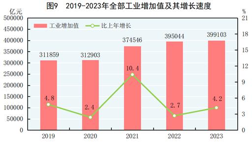 在工業(yè)和建筑業(yè)方面,全年全部工業(yè)增加值399103億元,比上年增長(zhǎng)4.2%。規(guī)模以上工業(yè)增加值增長(zhǎng)4.6%。在規(guī)模以上工業(yè)中,分經(jīng)濟(jì)類型看,國(guó)有控股企業(yè)增加值增長(zhǎng)5.0%;股份制企業(yè)增長(zhǎng)5.3%,外商及港澳臺(tái)商投資企業(yè)增長(zhǎng)1.4%;私營(yíng)企業(yè)增長(zhǎng)3.1%。分門(mén)類看,采礦業(yè)增長(zhǎng)2.3%,制造業(yè)增長(zhǎng)5.0%,電力、熱力、燃?xì)饧八a(chǎn)和供應(yīng)業(yè)增長(zhǎng)4.3%。