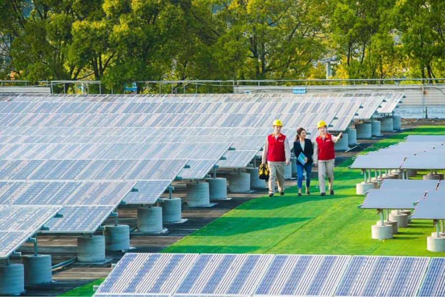 國(guó)網(wǎng)上海電力員工在光伏項(xiàng)目現(xiàn)場(chǎng)為客戶講解維護(hù)事宜。