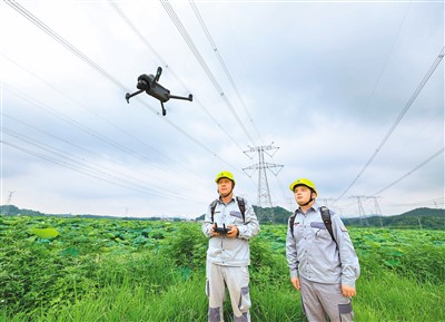 6月20日,在安徽池州,國網(wǎng)安徽電力運(yùn)維人員運(yùn)用無人機(jī)巡視特高壓重要輸電通道。