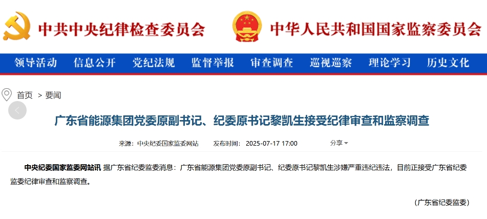 中央紀(jì)委國(guó)家監(jiān)委網(wǎng)站7月17日消息,據(jù)廣東省紀(jì)委監(jiān)委消息:廣東省能源集團(tuán)黨委原副書(shū)記、紀(jì)委原書(shū)記黎凱生涉嫌嚴(yán)重違紀(jì)違法,目前正接受廣東省紀(jì)委監(jiān)委紀(jì)律審查和監(jiān)察調(diào)查。