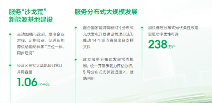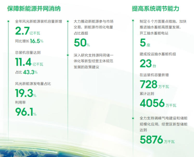 促進(jìn)新能源高質(zhì)量發(fā)展,經(jīng)營區(qū)三批大基地項(xiàng)目累計(jì)并網(wǎng)容量1.06億千瓦;加快低壓分布式光伏柔性改造,實(shí)現(xiàn)功率柔性可調(diào)238萬戶;全年風(fēng)光新能源裝機(jī)容量新增2.7億千瓦,同比增長16.5%;風(fēng)光新能源發(fā)電量占比19.3%,利用率96.1%;開工抽水蓄能電站5座,建成投運(yùn)抽水蓄能機(jī)組23臺,在運(yùn)裝機(jī)容量累計(jì)達(dá)到4056萬千瓦;經(jīng)營區(qū)新型儲(chǔ)能達(dá)到5876萬千瓦。