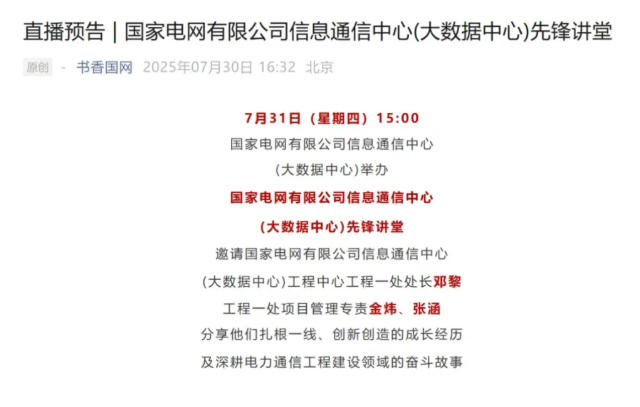 7月30日《書香國(guó)網(wǎng)》公眾號(hào)先鋒講堂直播預(yù)告推文顯示,國(guó)家電網(wǎng)有限公司信息通信中心(大數(shù)據(jù)中心)這一機(jī)構(gòu)名稱首次出現(xiàn)。