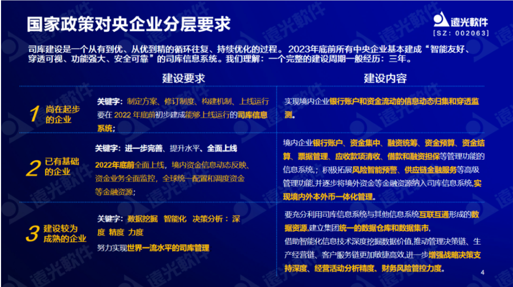 陳麗華表示,對于不同資金發(fā)展階段的企業(yè),資金管理的側重點有所不同,應當分層推進司庫體系建設。對于尚在起步階段的企業(yè),要著重于建設可上線運行的司庫信息系統(tǒng)。對于已有基礎的企業(yè),應進一步完善及拓展司庫管理功能,并逐步將境外資金等金融資源納入司庫信息系統(tǒng)。對于建設較為成熟的企業(yè),應當借助智能化信息技術深度挖掘企業(yè)的數(shù)據(jù)價值。