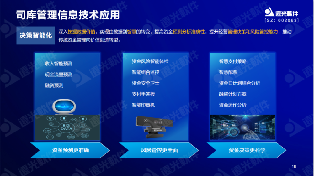 遠光軟件首先構建了各類預測模型融入至資金各個業(yè)務場景中,助力資金預測更準確。其次結合軟硬件機器人,通過采用遠光資金風險智能體檢、資金安全衛(wèi)士等智能硬件,使資金風險管控更全面。第三,在業(yè)務場景中通過智慧支付策略、資金日計劃綜合分析等智能化管理手段,使得資金決策更科學。