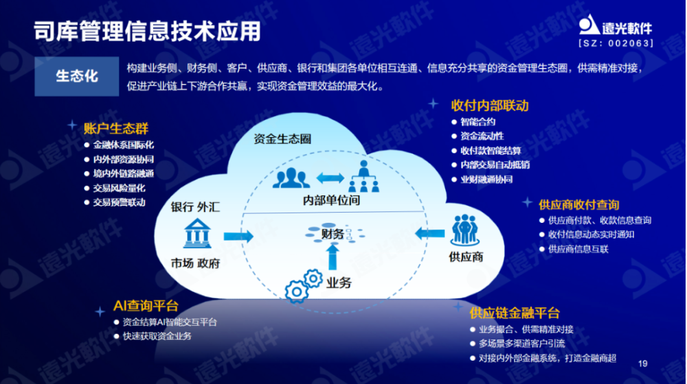 企業(yè)司庫管理需要構建業(yè)務側、財務側、客戶、供應商、銀行和集團各單位相互連通、信息充分共享的資金管理生態(tài)圈,對內覆蓋集團企業(yè)內部單位,促進業(yè)財深度融合,對外一方面聯(lián)通金融機構和監(jiān)管部門,構建賬戶生態(tài)群,一方面圍繞上下游供應商的管理,借助基于區(qū)塊鏈技術的供應鏈金融平臺,實現(xiàn)供需的精準對接,促進產(chǎn)業(yè)鏈上下游合作共贏。